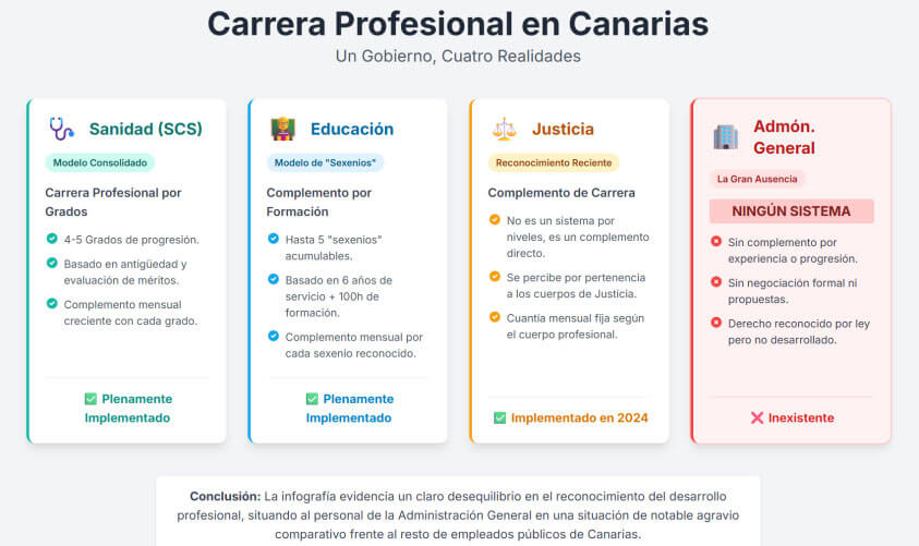 La inacción del Gobierno de Canarias resulta aún más sangrante cuando se observa la realidad de otros empleados públicos que trabajan para la misma Comunidad Autónoma. La política de «café para unos y para otros no» ha creado una brecha salarial y un sentimiento de agravio insostenible. Los tres grandes colectivos de empleados públicos en Canarias, a excepción de la Administración General, ya disponen de sistemas de carrera o complementos equivalentes: